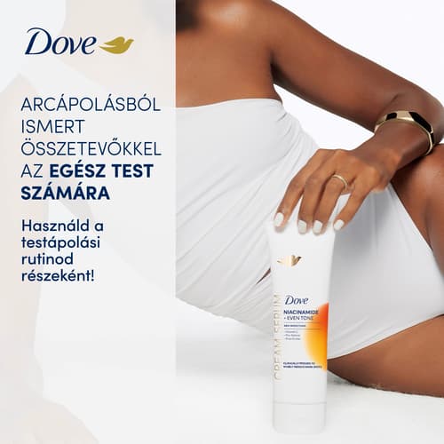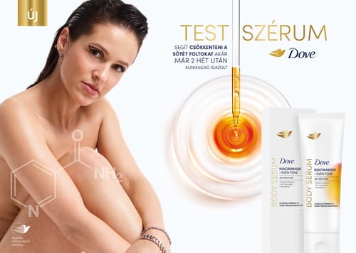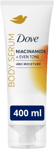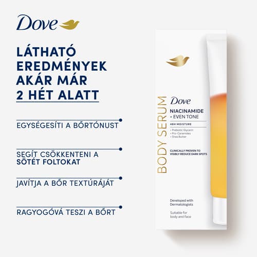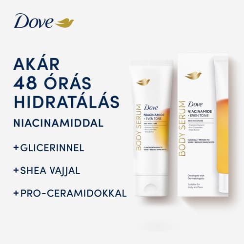 A Dove Niacinamide & Even Tone testszérum nem csupán hidratálja a bőrt, hanem támogatja természetes regenerációs folyamatait, javítva a bőr szerkezetét és feszességét. Arcápolásból ismert összetevői most az egész test számára biztosítanak ápolást, hogy bőröd ragyogó, sima és egészséges kinézetű legyen.