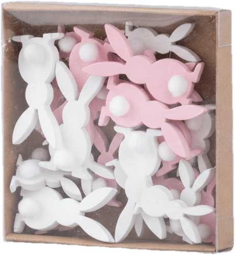 Dekoráció fa 24 db 25x45/15x35 mm nyuszik dobozban, fehér, rózsaszín