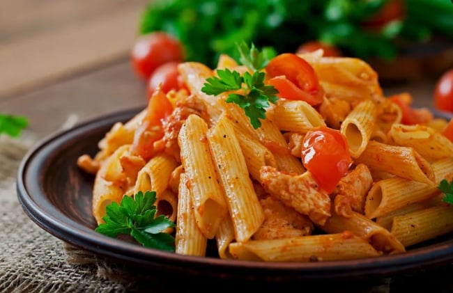 Hozzávalók: 30 ml olívaolaj, 360 g csirkemell, 20 g aszalt paradicsom, 200 ml tejszín, 200 ml víz, 200 g penne tészta, 10 g friss bazsalikom. Pirítsd meg a csirkemellet, majd add hozzá a tejszínt, vizet, aszalt paradicsomot és a tasak tartalmát. Főzd 2-3 percig, majd keverd össze a kifőtt tésztával. Tálald friss bazsalikommal.