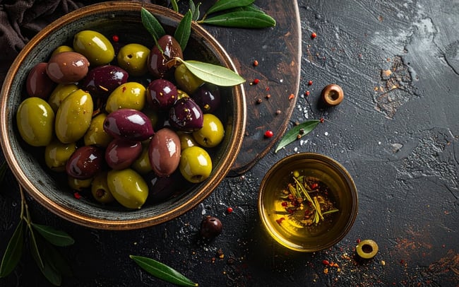Zöld olívabogyó, Kalamata olívabogyó, szűz olívaolaj, tengeri só, kakukkfű, oregánó, rozmaring, ecet, savanyúságot szabályozó anyagok: citromsav, tejsav; antioxidáns: aszkorbinsav; tartósítószer: szorbinsav.