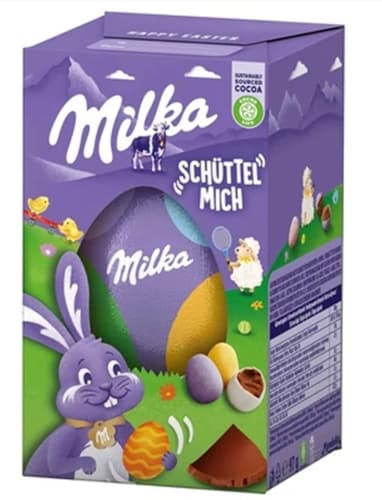 A Milka shell egg egy finom tejcsokoládé tojás, amelyet alpesi tej felhasználásával készítettek. A belsejében ropogós cukorbevonatú tejcsokoládé tojások találhatók, amelyek szintén alpesi tejből készültek.