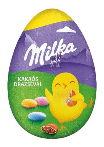 Milka Funny Eggs tejcsokoládé figurák, amelyek belsejében színes cukorbevonatú kakaós drazsé található. A termék alpesi tej felhasználásával készült, amely a Milka márka gyengédségét tükrözi.