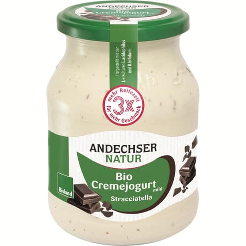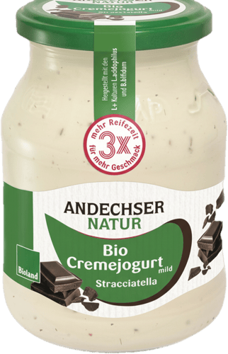 Andechser Bio tejszínes joghurt sztracsatella 3,7 % üvegben egy krémesen gazdag, bio tejtermék, amely a tej természetes ízét a sztracsatella csokoládéaprólékokkal kombinálja. A 3,7 % zsírtartalomnak köszönhetően a joghurt telt, selymes textúrájú, amely azonnal érezhető minden kortyban, miközben a csokoládédarabkák roppanó textúrát és karakteres kakaóízt adnak hozzá.