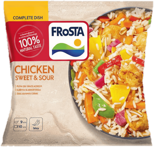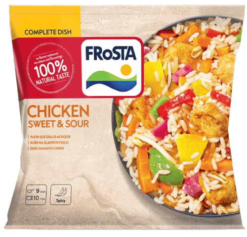 Ázsiai stílusú rizses étel pácolt, főtt csirkemellfalatokkal, édes-savanyú mártásban (22%). Gyorsfagyasztott termék.