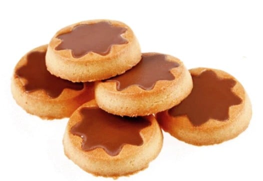 Tejes Krémmel (16 %) Töltött Keksz Egy Réteg Alpesi Tej Felhasználásával Készült Tejcsokoládéval (23 %).
