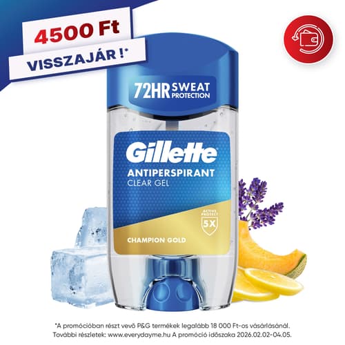 Válassza a Gillette izzadásgátlót a legkiválóbb 72 órás izzadás elleni védelemért, hogy minden kihívásra készen álljon, és mindig a legjobb formáját hozza! Az 5X-ös aktív védelmi technológiával rendelkező Gillette izzadásgátló gél gyorsan hat, egyszerre véd az izzadás és a kellemetlen szagok ellen, miközben megelőzi a fehér foltok kialakulását és felveszi a küzdelmet a kellemetlen szagokat okozó baktériumokkal szemben. Élvezze a Gillette Champion Gold hosszan tartó, vizes illatát: a szabad levegő frissességét, dinnyés-citrusos jegyekkel kiegészítve! A Gillette izzadásgátló gél stift nem hagyja cserben. 2-szer erősebb védelmet nyújt az izzadás ellen a P&G golyós dezodorokhoz képest, áttetsző zselés formulája pedig láthatatlan réteget képez, és nem hagy nyomot a bőrön. Vigyen fel egy vékony réteget a hónaljára, és élvezze a védelmet, bármilyen kihívások előtt is áll!