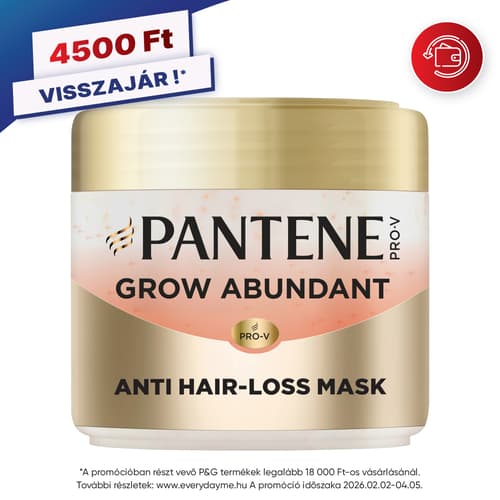 Teltebb hatást szeretne elérni? Fedezze fel a Pantene Grow Abundant hajhullás elleni hajpakolást, amely mélyen táplálja a károsodott hajat, miközben elősegít a haj növekedését*. Az 2000 mg PRO-VITAMIN KOMPLEXSZEL és aminosavakkal dúsított formula erősebbé*, a töredezéssel szemben ellenállóbbá, valamint láthatóan egészségesebbé és dúsabbá* varázsolja a hajat. A legkiválóbb eredmény érdekében használja együtt a Grow Abundant szérummal. *Hosszabb, erősebb haj a hajformázás okozta károsodással szemben, a Pantene Volume/Aqualight/Clarify samponok használatához képest. Sűrűbb, dúsabb haj klinikai vizsgálat alapján a placebóval szemben