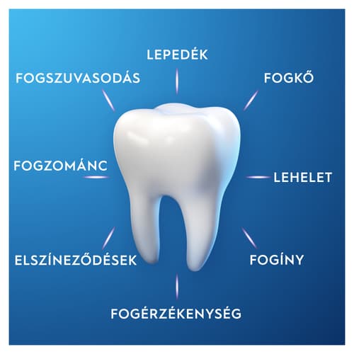 - 8 területen nyújt védelmet: fogszuvasodás, lepedék, fogkő, lehelet, fogíny, érzékenység, felületi elszíneződések, fogzománc