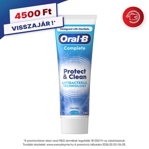 Oral-B Complete Protect & Clean Fogkrém Antibakteriális Cinkkel, 75 mlAz Oral-B Complete fogkrémcsalád a cinktartalmú antibakteriális technológiájának köszönhetően klinikailag igazolt mélytisztító hatást és védelmet kínál, valamint felveszi a küzdelmet a rossz lehelet kiváltó okával, a kellemetlen szagokat okozó bakteriális lepedékkel szemben, a 24 órán át tartó friss lehelet érdekében (napi kétszeri használat mellett). Három változatban (Protect & Clean, Ultimate Fresh és Extra White) és 2 ízben (Extra cool és Cool mint) kapható.