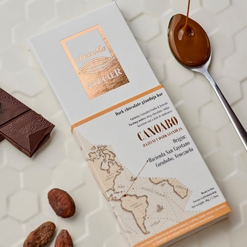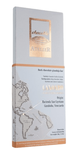 Atelier bean to bar kollekcióban különböző táblás csokoládékat kínálunk egzotikus vagy ritkán látott összetevőkkel. Gianduja étcsokoládé Canoabo-ból származó kakaóbabból.