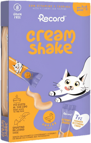 Kényeztesd cicádat egy krémes, ízletes falattal, ami nemcsak finom, hanem a macska természetes nassolási igényét is kielégíti! A Record Cream Shake nedves jutalomfalat kacsahússal minden falatban örömöt és gondoskodást rejt.