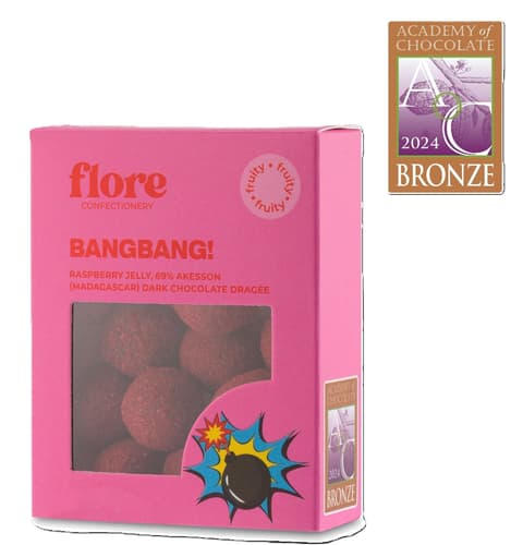 Flore Confectionery BangBang! drazsé: málnazselé, madagaszkári 69%-os Åkesson étcsokoládé drazsé