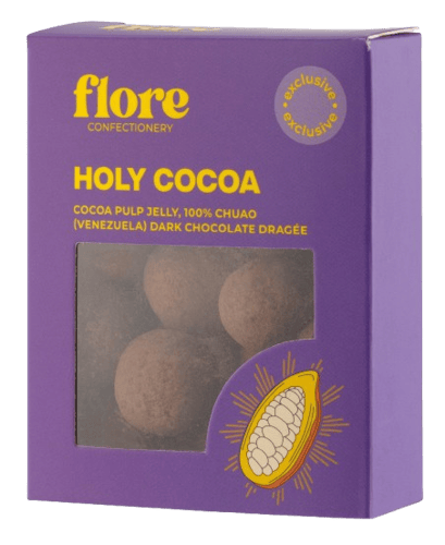 Flore Confectionery Szent Kakaó drazsé: kakaó juice zselé, 100%-os venezuelai Chuao étcsokoládé drazsé