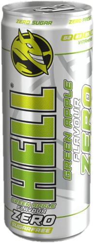 HELL Green Apple flavour ZERO Energy Drink – Zöldalmaízű, koffeintartalmú, szénsavas energiaital hozzáadott vitaminokkal és édesítőszerekkel. Cukormentes termék. Pasztőrözött.