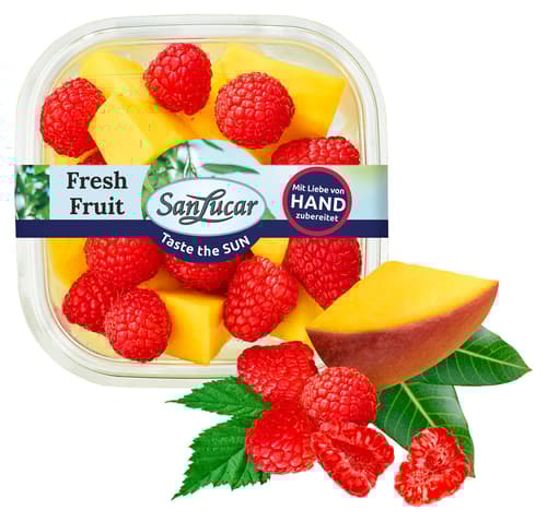 A San Lucar Mangó‑Málna mix egy friss és üde gyümölcsmix, amely a lédús, édes mangó és a friss, enyhén savanykás málna harmonikus kombinációját kínálja. A gyümölcsök természetes aromája élénk és intenzív, minden falatban frissítő, gyümölcsös élményt nyújt.