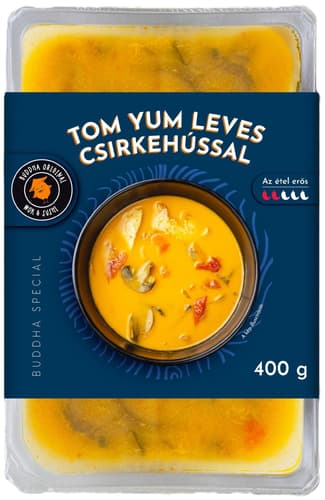 A termék garantált eltarthatósága a megrendelés kézbesítését követően: 4 nap.Ha a vásárolt termék eltarthatósági ideje ennél rövidebb, vedd fel velünk a kapcsolatot, mi pedig kredit formájában visszatérítjük az árát. Nem vonatkozik a Mentsd meg az ételt szekcióba tartozó termékekre.ivóvíz, gomba [(csiperke gomba, ivóvíz, konyhasó, savanyúságot szabályzó anyag (citromsav), antioxidáns (aszkorbinsav)], kókusztej [kókuszdió kivonat, víz, emulgeálószer (polioxi-etilén-szorbitan-monosztearát)], zöldségek változó arányban (11,2%) (paradicsom, sárgarépa, vöröshagyma, újhagyma, lilahagyma), csirkehús készítmény (11%) (csirke, rizskeményítő, dextróz, só), cukor, citromlé, darált csípős paprika, nátrium-glutamát, só, galanga, citromnád, koriander, étolaj, kaffír lime levél, édes paprika, fokhagyma.