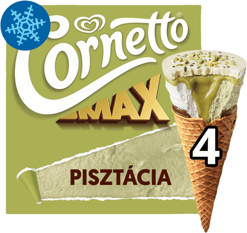 Éld át a selymes krémesség és az ellenállhatatlan ropogósság találkozását az új Cornetto Max Pisztáciával! A jégkrém tetejét fehér bevonómassza korong és pörkölt pisztáciadarabok díszítik. Belül lágy pisztácia jégkrém és intenzív pisztácia szósz vár, az egészet pedig a jól ismert, ropogós ostyatölcsér koronázza meg.