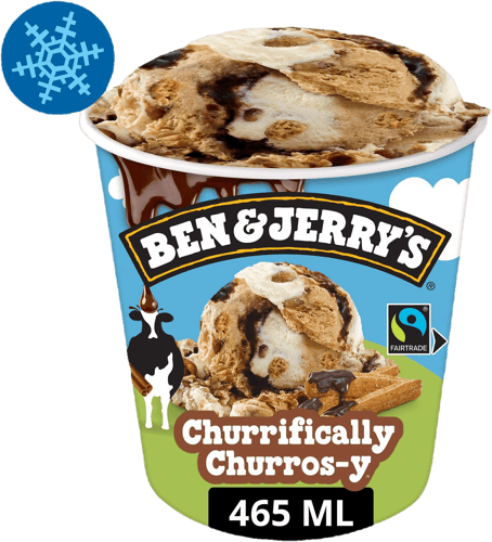 Ben&Jerry's Churrifically Churros-y jégkrém a frissen sült churros ízét hozza el, karamell és tejszín ízű jégkrémmel, ropogós fahéjas cukor darabkákkal, churros darabokkal és kakaós szószörvénnyel.