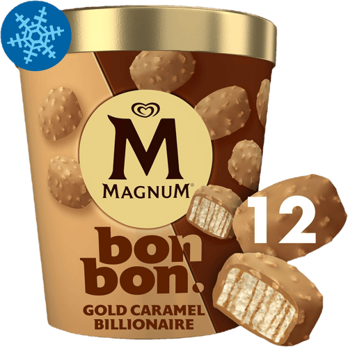 A Magnum Gold Karamell Billionaire Bonbonok a prémium minőségű desszertek közé tartoznak. A 12 darabos kiszerelés ideális megosztáshoz, minden falatban selymes vanília jégkrém, sós karamellás szósz és ropogós kekszdarabkákkal dúsított karamelles fehér csokoládé található.