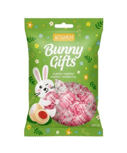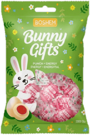 Tejszínes eper ízű, töltött (55%), fehér masszával bevont (45%) édesség.