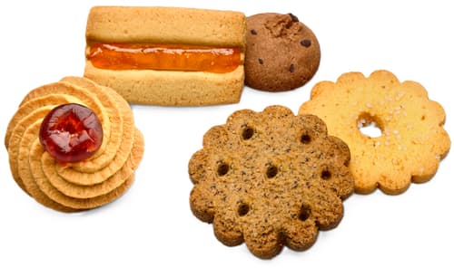 Teljes kiőrlésű omlós kekszek: kukoricakeményítő, margarin (növényi zsírok (kókusz) és növényi olajok (napraforgó), víz), cukor, rizsliszt, tojás, hajdinaliszt 7,1%, kukoricaliszt, dextróz, sűrítőanyagok: E464, guarmagliszt, xantángumi; aromák, só, térfogatnövelő szerek: nátrium-hidrogén-karbonát, dinátrium-pirofoszfát.