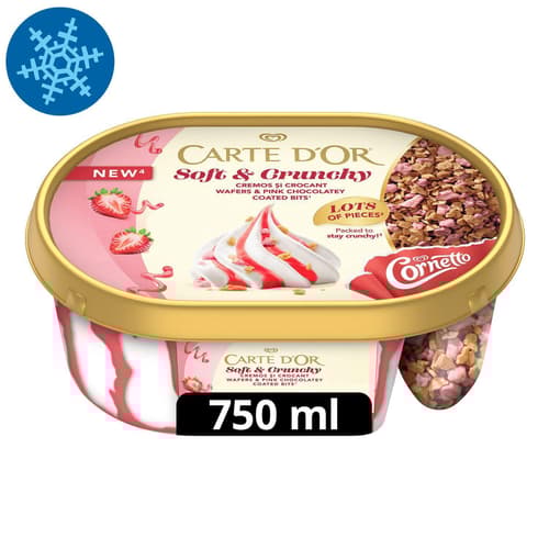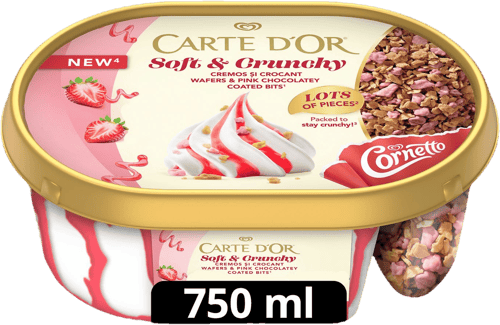 Carte d'Or Soft & Crunchy Eper: az igazi ropogós élvezet! Fedezd fel a selymesen könnyed vanília ízű jégkrémet, melyet lágy epres szószörvény tesz még gazdagabbá. Az igazi izgalmat a jégkrémtől külön kamrában található, ropogós eper ízű fehér csokoládés bevonómasszával bevont tölcsérmorzsa darabkák és a Cornetto tölcsér szórat adják, amit kedved szerint adagolhatsz. A krémes és a ropogós textúrák tökéletes találkozása minden falatban!