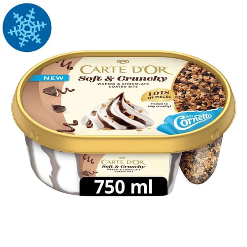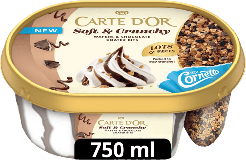 Carte d'Or Soft & Crunchy Kakaó: az igazi ropogós élvezet! Fedezd fel a bársonyosan krémes vanília ízű jégkrémet, melyet lágy kakaós szószörvény tesz még gazdagabbá. Az igazi izgalom a jégkrémtől külön kamrában található, ropogós Cornetto tölcsérdarabok és a csokoládéval bevont tölcsérmorzsa szórat, amit kedved szerint adagolhatsz. A krémes és a ropogós textúrák tökéletes találkozása minden falatban!