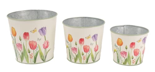 Ez a Kubo által kínált 3 db-os bádog kaspó szett ideális választás otthoni dekorációhoz. A kaspók tulipánmintával díszítettek, és méretük 11,5-15 cm között változik, így különböző növények számára is alkalmasak.