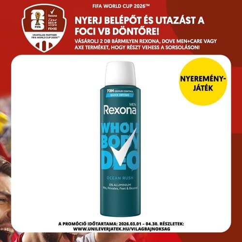 Ez a Rexona Férfi Teljes Test Dezodor Ocean Rush illattal akár 72 órás védelmet nyújt a kellemetlen szagok ellen. Alumíniumsó-mentes formulája kíméletes a bőrhöz, és a test bármely részén használható – legyen szó hónaljról, mellkasról vagy lábakról. Ez az EU-ból származó 150 ml-es spray láthatatlanul szívódik fel, nem hagy foltot a ruhán, így egész nap frissen és magabiztosan tarthat.