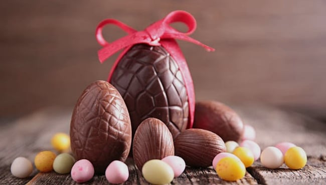 Üreges tejcsokoládé tojás, egy tasak tejcsokoládéba mártott sós pereccel.
