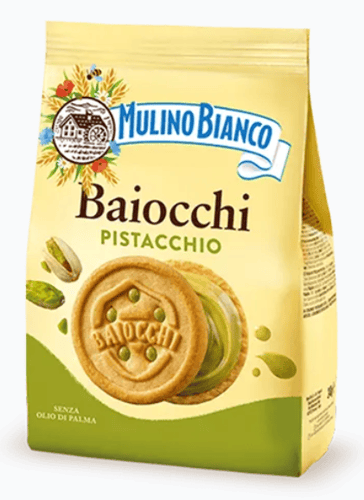 A Mulino Bianco Baiocchi pisztáciás krémmel az olasz édességgyártás egyik legkifinomultabb és legkedveltebb darabja. A Mulino Bianco (a Barilla csoport tagja) évtizedek óta a minőségi reggelik és uzsonnák szakértője, a Baiocchi pedig a márka egyik ikonikus "szendvicskeksz" családja, amely ebben a változatban modern, exkluzív köntöst kapott.