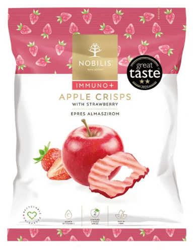 - Fenntartartó forrásból származó magyar almából készült ropogós szirmok Földieperrel és Csipkebogyó kivonattal - a nyár íze minden falatban.