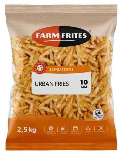 A Farm Frites Urban Fries fűszeres hasábburgonya elősütött, gyorsfagyasztott burgonyatermék. Gyorsan elkészíthető köret vagy snack otthoni használatra.