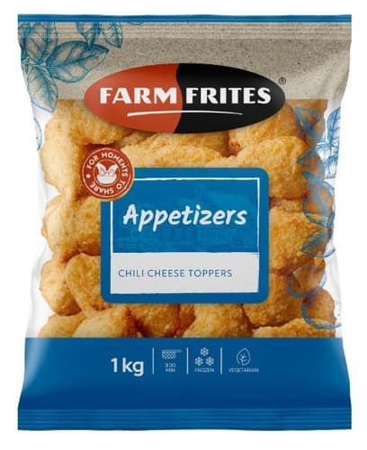 A Farm Frites Chili Cheese Toppers elősütött, mélyfagyasztott, sajttal töltött falat, enyhén csípős chili ízvilággal. Ropogósra süthető snack vagy köret kiegészítő.
