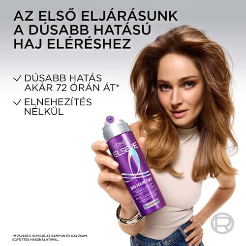 Azonnali volument ad a L'Oréal Paris Elseve Big Hair Day Refreshing Volume Spray! Ez az innovatív francia spray, tri-dispenser adagolójával, mindössze 3 másodperc alatt +0.4 cm-rel emeli meg a hajtöveket. A hajad akár 48 órán át tisztábbnak tűnhet, miközben hidratált, puha és fényes marad. Használd bátran száraz hajra, akár mosások között is, ez a 200 ml-es termék a gyors volumen titka.