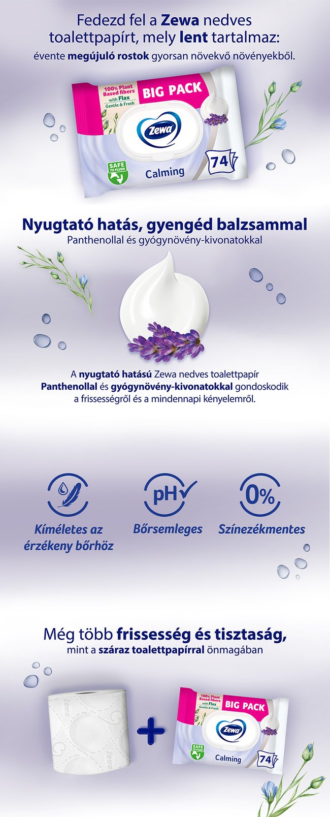 Élvezd a friss és tiszta érzést minden alkalommal! A Zewa Calming nedves toalettpapír gyengéd a bőrhöz, toaletten lehúzható, és biológiailag lebomló, így a környezetedet is kíméli.