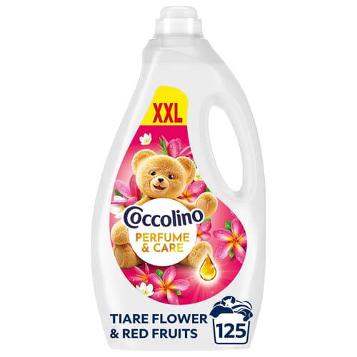 Coccolino Perfume & Care Tiare Flower & Red Fruits fabric softener makes clothes soft and leaves a long-lasting fragrance. It combines the scent notes of exotic tiare flower and red berries. The 2875 ml pack is enough for approx. 125 washes.