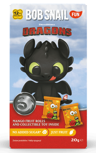 Ukrajna,Bob Snail mangó gyümölcstekercs Dragon játékkal a gyümölcsös nassolnivalók kedvelőinek. A csomagban mangóalapú gyümölcstekercsek és egy Dragon játék található.