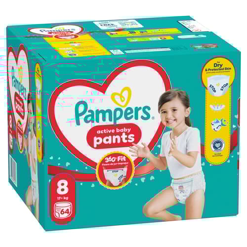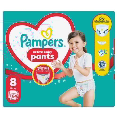 Amikor kisbabád aktívabbá válik, kényelmesen illeszkedő és megbízható védelmet nyújtó pelusra lesz szüksége, ami minden mozdulatát követi. A különleges Stop & Protect rendszernek köszönhetően a Pampers Active Baby bugyipelenka rendkívüli, 360°-os illeszkedést biztosít a szivárgás ellen, éjjel-nappal. A Pampers Active Baby bugyipelenka Stop & Protect rendszere a következőkből áll: oldalsó szivárgás elleni védőgát, 360°-os rugalmas derékrész, mely mozgás közben is igazodik kisbabád alakjához, és szupererős nedvszívó mag, mely akár 12 órán át tartó védelmet nyújt. Az összes többi nadrágpelenkához hasonlóan a Pampers Active Baby bugyipelenkát is könnyű cserélni, még akkor is, ha közben kisbabád izeg-mozog.