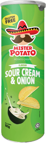 Malajzia,MISTER POTATO Sour Cream & Onion burgonyachips – a hagyma karaktere és a tejföl selymes íze egy elegáns, klasszikus párosításban. Minden falatban ott a természetes burgonyaíz és a magabiztos roppanás.
