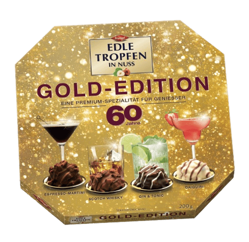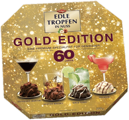 Az Edle Tropfen Gold Edition alkohollal töltött praliné, tejcsokoládé és fehér csokoládé bevonattal, pirított mogyoródarabokkal. Alkoholtartalom: 6.3%.