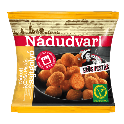 A Nádudvari Erős Pistás rántott sajt panírozott, formázott, gyorsfagyasztott félkész termék. Sütés után kívül ropogós, belül lágy sajtos állagot ad.