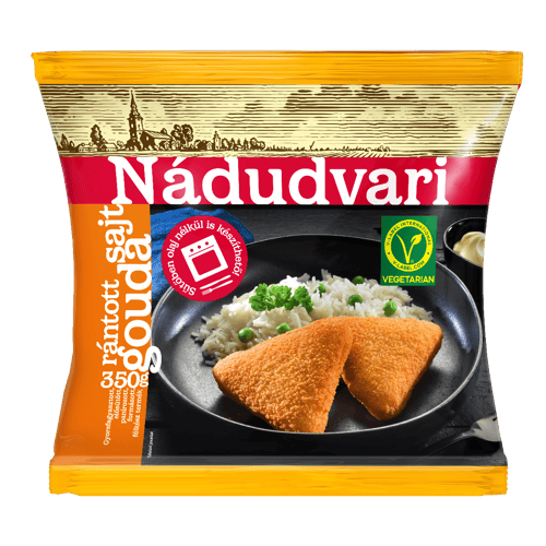 A Nádudvari rántott Gouda sajt panírozott, formázott, gyorsfagyasztott félkész termék. Sütés után lágy sajtbelsőt és ropogós bundát ad.