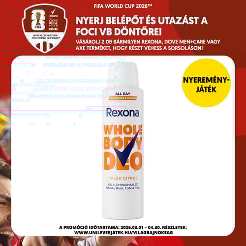 Bemutatjuk a Rexona új, teljes testre kifejlesztett dezodorcsaládját – ott hat, ahol a legnagyobb szükség van rá. Hónalj, mellkas, lábfej és azon túl: ez az erőteljes formula akár 72 órás szagkontrollt biztosít, láthatatlanul felvihető a mindennapi magabiztosságért. Alumíniumsókat nem tartalmaz (0%), így gyengéd a bőrhöz, miközben hatékonyan veszi fel a harcot a kellemetlen szagokkal – bárhová is mész.