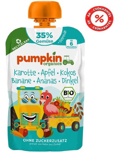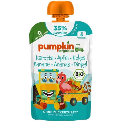 Németország,A Pumpkin Organics bio püré sárgarépa, alma, banán, ananász és kókusz ízvilágát kombinálja tönköllyel, 6 hónapos kortól. Krémes állaga megkönnyíti a hozzátáplálás időszakát.