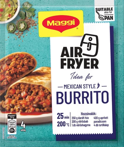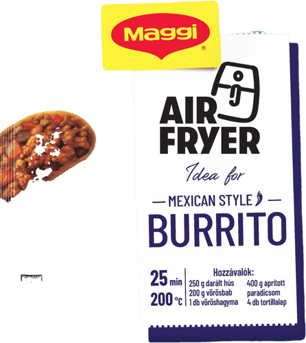 A MAGGI Burrito alap mexikói ihletésű fűszerkeverék burritótöltelék gyors elkészítéséhez. Az AIRFRYER termékcsalád részeként 4 adaghoz kínál irányt és ízprofilt. A 2025-ben bevezetett AIRFRYER családot egy új termékkel, a MAGGI Burrito alappal bővítjük. A népszerű mexikói ihletésű étel immárom airfryerben is elkészíthető 4 fő részére. Próbáld ki a többi MAGGI AIRFRYER terméket is!