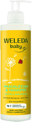 Németország,A Weleda Bio körömvirágos natúr baba tusfürdő és sampon enyhén habzó, mindennapi tisztításhoz való termék tetőtől talpig. Kíméletes a bőrhöz és a szemhez.