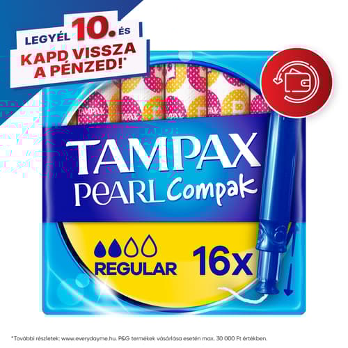 A Tampax Pearl Compak a Tampax legkiválóbb kényelmet, védelmet és diszkréciót nyújtó tamponja. Illatanyagmentes. A Tampax Pearl Compak tampon kompakt, diszkrét műanyag applikátorral rendelkezik, amely a lekerekített csúcsának köszönhetően könnyen felhelyezhető. A csúszásmentes felületű applikátort könnyű kézben tartani és irányítani. A Tampax Pearl Compak tampon alakkövető tulajdonságának köszönhetően gyengéden, a test vonalához igazodva fokozatosan tágul. A LeakGuard szegély segít megakadályozni a szivárgást. A színes csomagolású Tampax Pearl Compak tamponok a teljes diszkréció érdekében könnyen és halkan kibonthatók, valamint egy tárcában is higiénikusan tárolhatók. A Tampax Pearl Compak Regular a Tampax legkiválóbb tamponja gyenge vagy közepes erősségű a menzesz napjaira. A Tampax Pearl Compak tamponokat nőgyógyászatilag teszteltük. A termék ártalmas anyagokkal szembeni független vizsgálatát az Oeko-Tex végezte. A Tampax termékekről bővebb információ a weboldalunkon olvasható.
