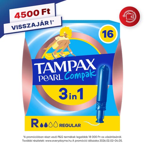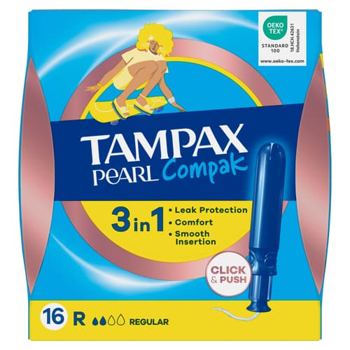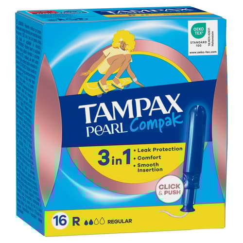 A Tampax Pearl Compak a Tampax legkiválóbb kényelmet, védelmet és diszkréciót nyújtó tamponja. Illatanyagmentes. A Tampax Pearl Compak tampon kompakt, diszkrét műanyag applikátorral rendelkezik, amely a lekerekített csúcsának köszönhetően könnyen felhelyezhető. A csúszásmentes felületű applikátort könnyű kézben tartani és irányítani. A Tampax Pearl Compak tampon alakkövető tulajdonságának köszönhetően gyengéden, a test vonalához igazodva fokozatosan tágul. A LeakGuard szegély segít megakadályozni a szivárgást. A színes csomagolású Tampax Pearl Compak tamponok a teljes diszkréció érdekében könnyen és halkan kibonthatók, valamint egy tárcában is higiénikusan tárolhatók. A Tampax Pearl Compak Regular a Tampax legkiválóbb tamponja gyenge vagy közepes erősségű a menzesz napjaira. A Tampax Pearl Compak tamponokat nőgyógyászatilag teszteltük. A termék ártalmas anyagokkal szembeni független vizsgálatát az Oeko-Tex végezte. A Tampax termékekről bővebb információ a weboldalunkon olvasható.