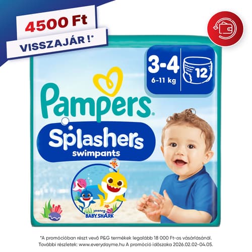 Kisbabád nyugodtan pancsolhat a vízben a Pampers Splashers eldobható úszópelenkában! Az átlagos pelenkákkal ellentétben a Pampers Splashers nem duzzad meg a vízben: fürdőbugyihoz hasonló kényelmet, és megbízható Pampers védelmet kínál. A bájos Baby Shark™ mintáknak köszönhetően hamarosan a kis rajongók kedvence lesz. Biztonságos védelmet nyújt a vízben, mivel a Pampers Splashers úszópelenka dupla védőgátjai kényelmesen illeszkednek kisbabád combjaihoz, így elősegíti, hogy a pelenka tartalma benn maradjon. Megfelelő viselet az uszodában, a strandon vagy akár az aquaparkban. Az egyedülálló 360°-os, rugalmas derékgumírozásnak köszönhetően kényelmesen illeszkedik, ugyanakkor könnyen feladható és levehető, még nedvesen is. A Pampers Splashers könnyen feltéphető oldalakkal rendelkezik, így gyorsan eltávolítható és kidobható.
